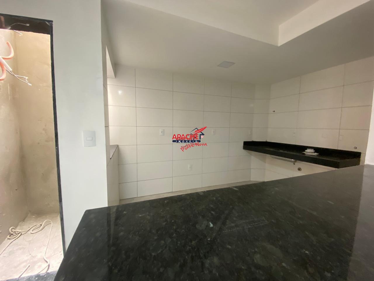 02 quartos, sendo 01 suíte. Sala para 02 ambientes e cozinha americana com bancadas em granito, banheiro social com nicho esculpido e área de serviço.