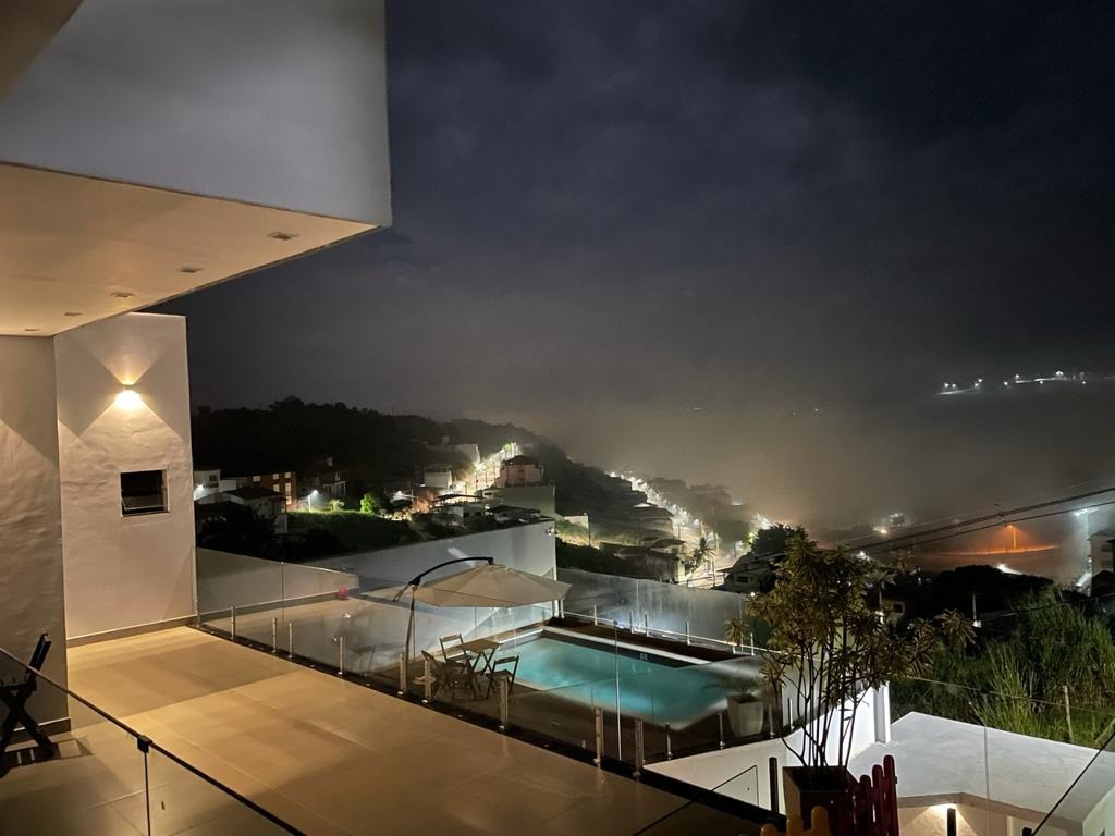 Sala ampla com visão privilegiada para o bairro, com lindo por do sol, ligada a cozinha com pedra-ilha e torre elétrica;